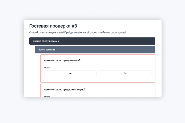 Проверки глазами гостей. Отдельный модуль позволяет собирать обратную связь от посетителей и использовать тайных гостей. Вы видите сервис со стороны клиента и понимаете, где реально теряется качество, а где всё работает отлично.