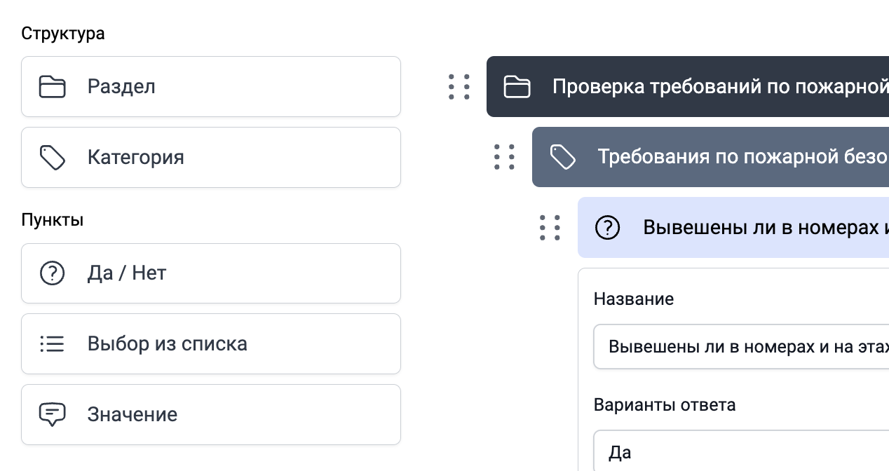 - Этот функционал не только помогает структурировать и отслеживать деятельность организации, но также облегчает назначение проверок и задач конкретным объектам.