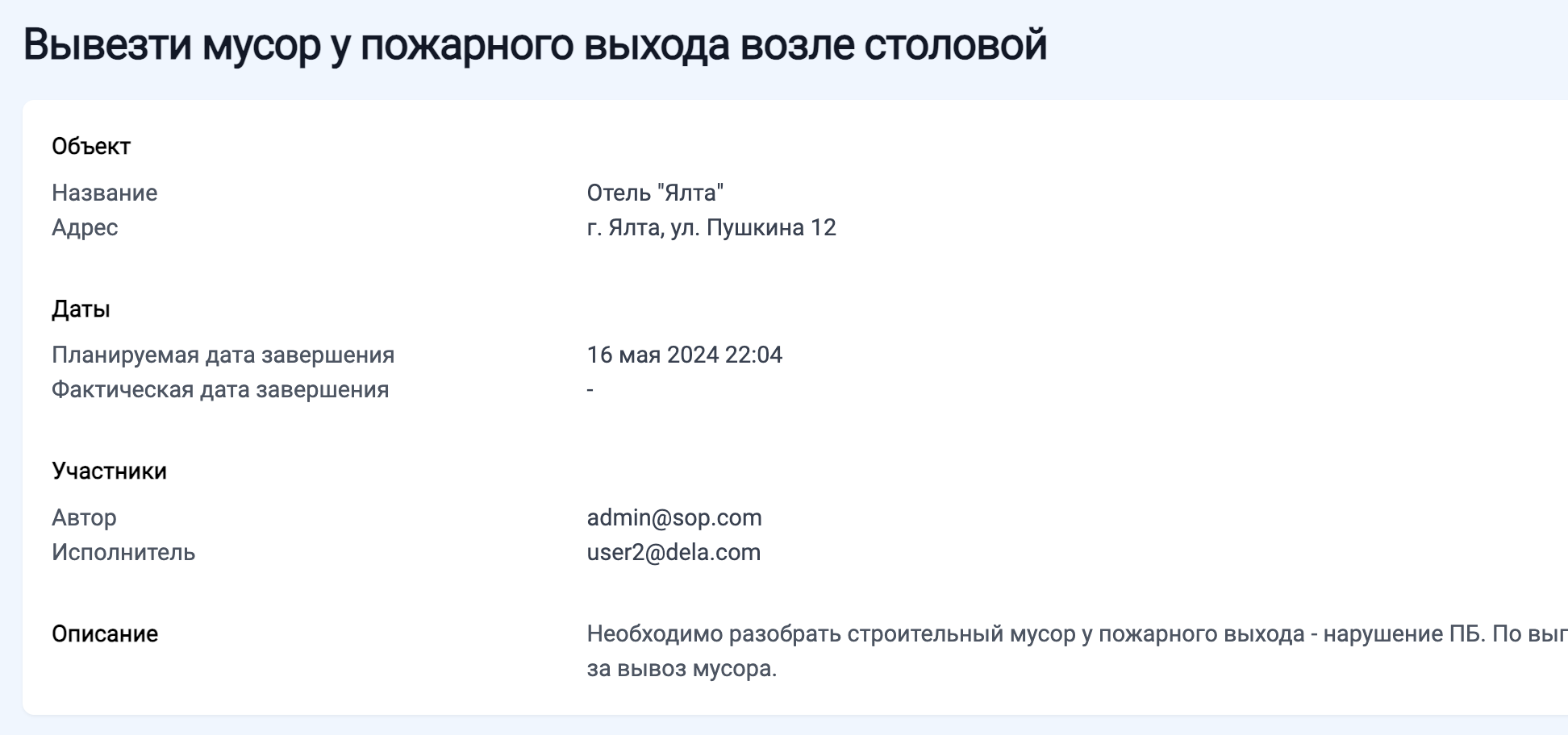 Создавайте задачи как для исправления выявленных нарушений, так и для штатных поручений сотрудникам. Сервис облегчает процесс контроля выполнения задач и отслеживания их актуальности.